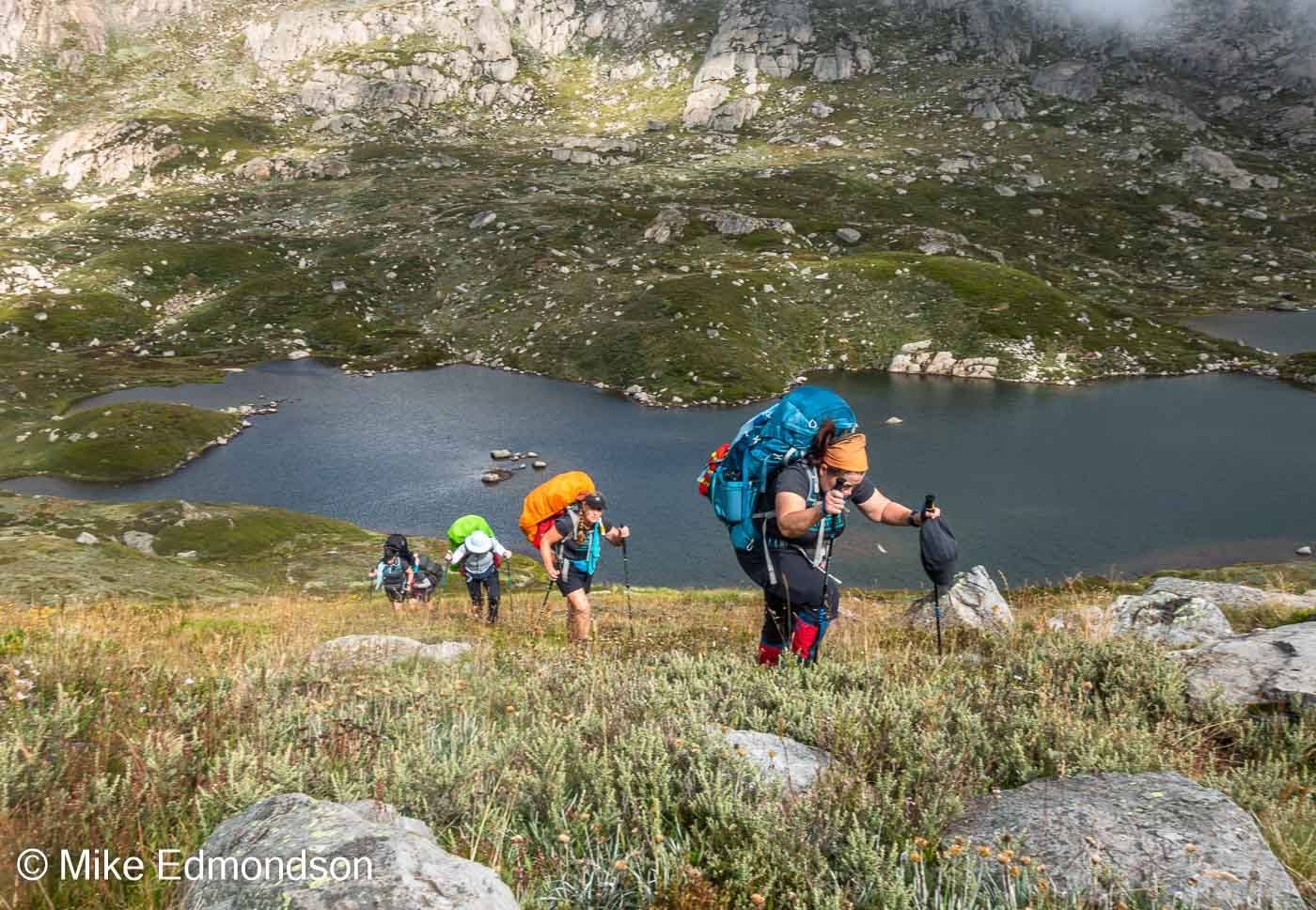 A- ACCEPT THE UNEXPECTED. All sorts of things can go awry on a trip- the weather, your gear, anyone’s health, track closures…really an endless list. We were met with all the above. Setting off in the pouring rain- not getting the expected views at first- spending a wet night isolated in our tents, losing one of the team due to ill health. We were given very short notice that the Main Range track was going to be closed- this meant one day having to be diverted off track down the steep slope to Lake Albina…and back up again- hard work with our very full packs.